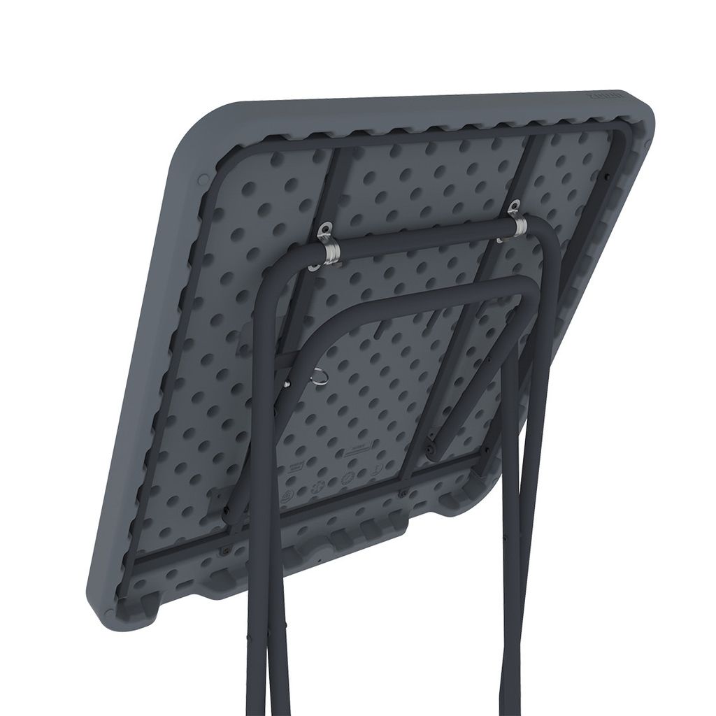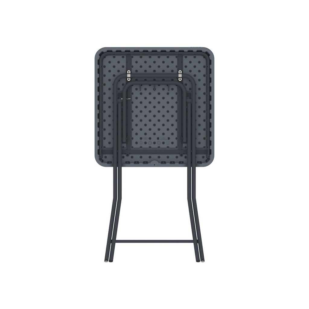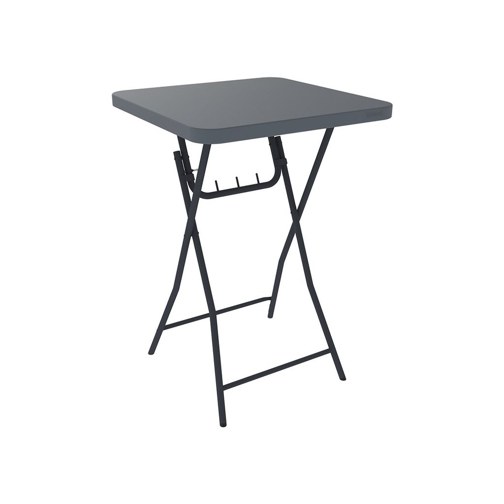 Kvadratiskt ståbord med mörkgrå skiva med krokar för väskor eller jackor. Perfekt för konferansen. Storlek: 76x76cm, Höjd: 110cm.