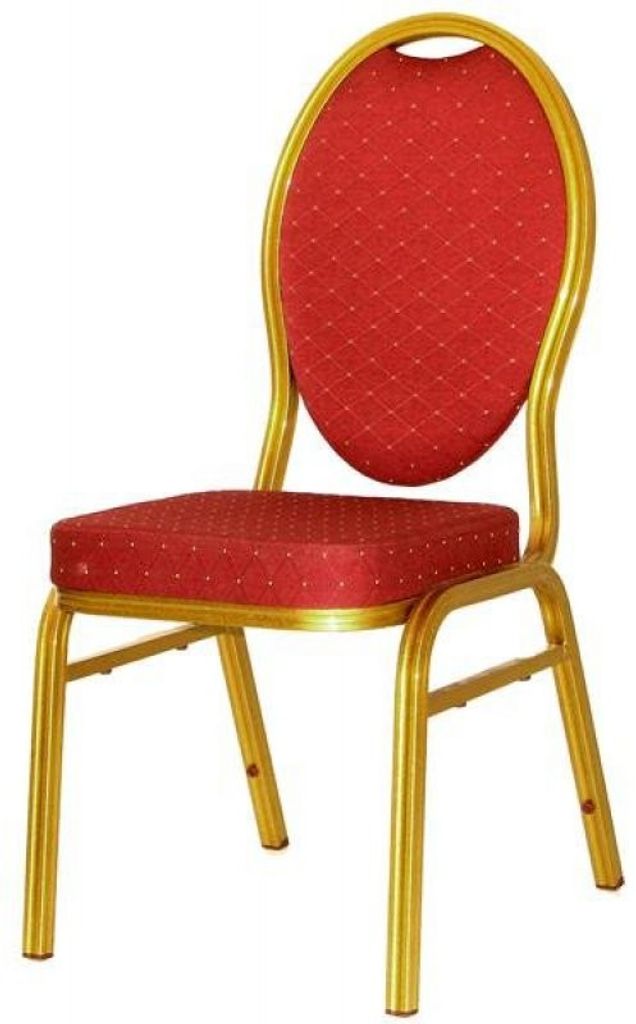 Vår lyxigaste stol med tjocka dynor och stabil ram. Rött tyg med guldställning. Staplingsbar.