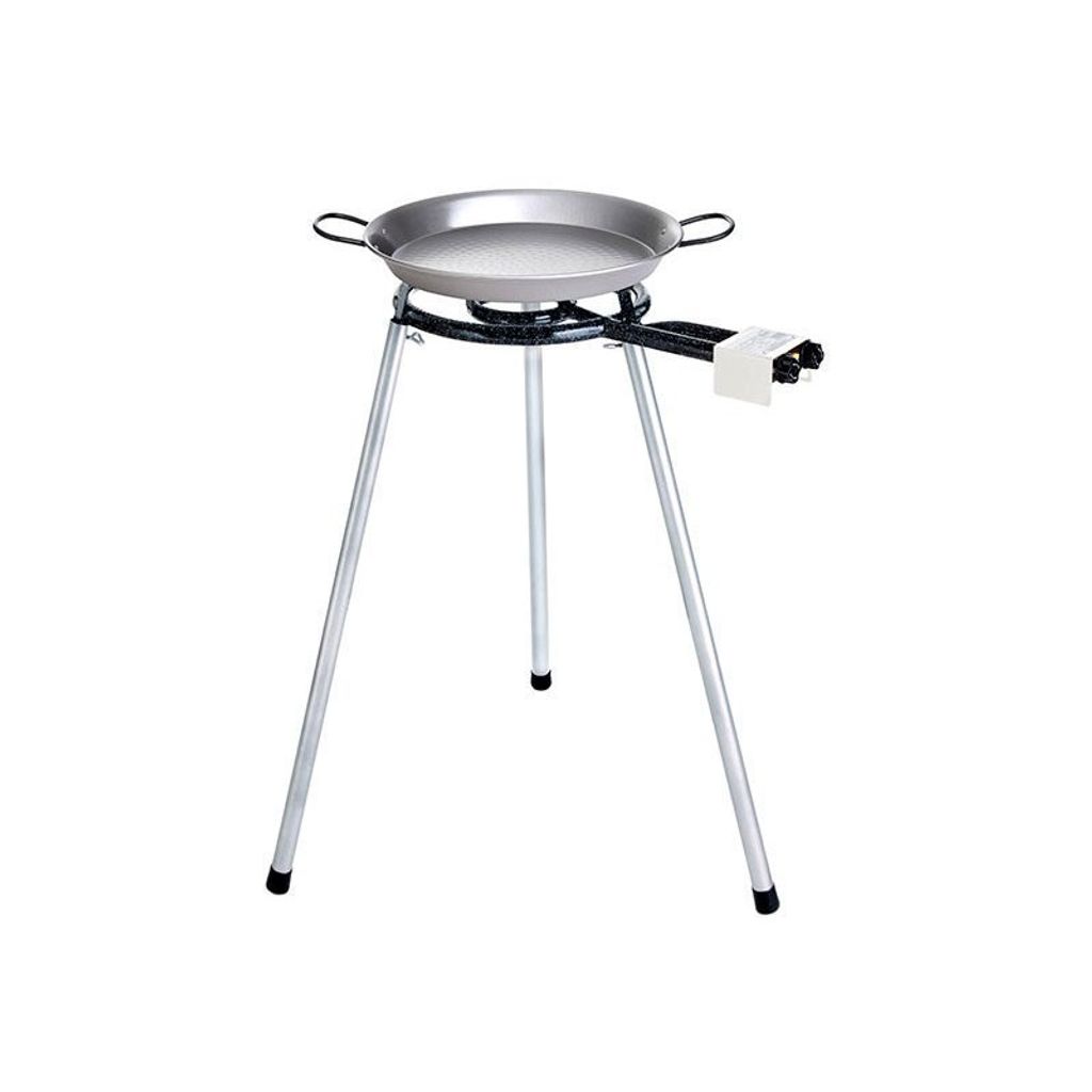 Paellapanna 60cm diameter, med brännare och stativ. Går att ställa på bord utan benen. Gas P11 ingår.