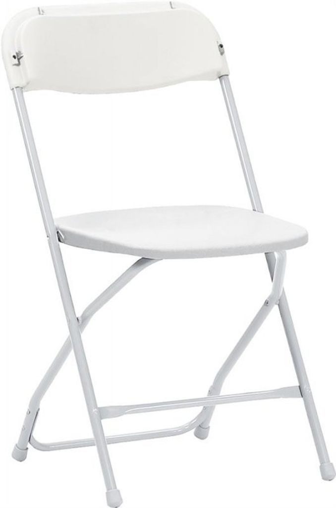 En vit plaststol av den enklaste modellen med vitlackade metallrör. Väldigt liten när den är hopfälld. B:45xD:43xH:80cm
